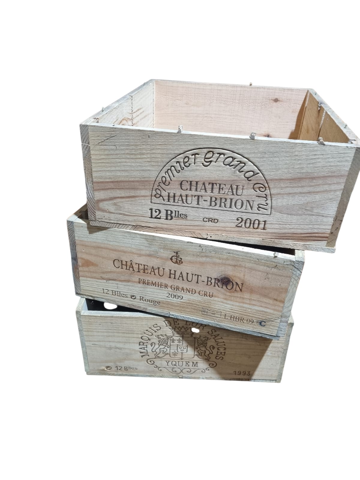 These wine crates are from high-end vineyards in countries and regions famous for their vintages.