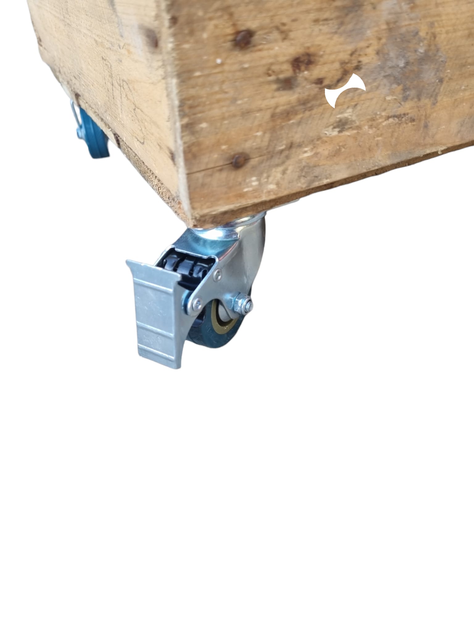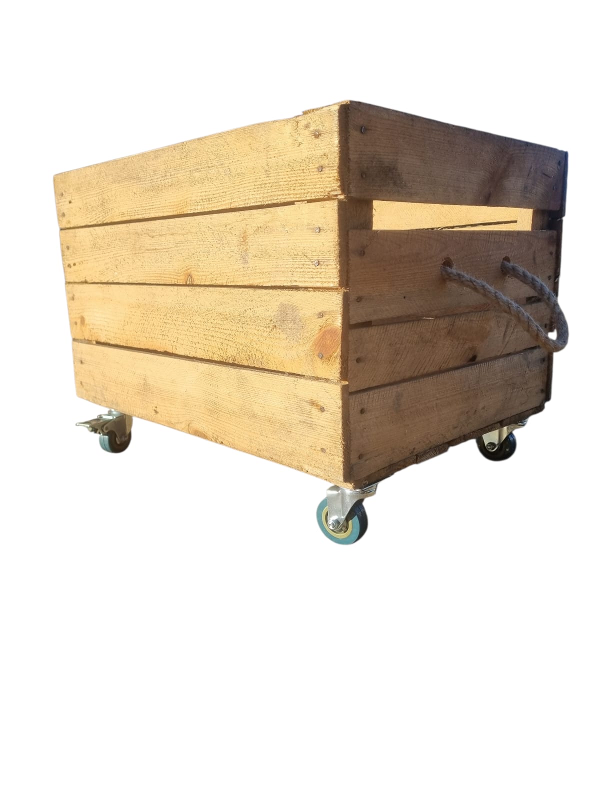 This is one of our standard European Apple Crates which we have added two rope handles to either side and attached four heavy duty castors to the base. Two of the castors have brakes which can be put on / off by foot.
